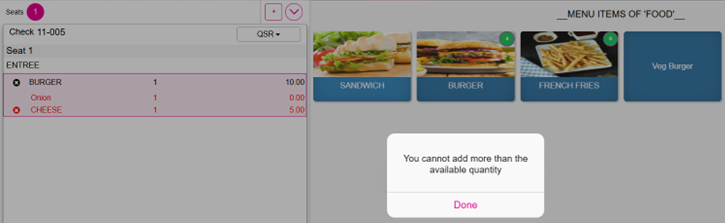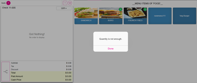 - When any Menu Void takes place, then the Quantity of the Item will be added to the respective Item. When the Quantity of the Menu Item is 0 and that Item is selected then the pop-up message 'Quantity is not enough' appears along with the Done button.