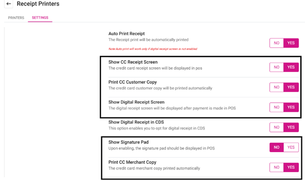 Print CC Customer Copy – When the toggle is set to YES, then it will be printed automatically. When set to NO, the credit card customer copy will not be printed automatically.