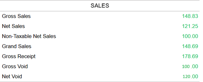 Gross Sales: The value of All Sale – Non-Sale Revenue, which = Sum of All Tender + Gross Void + Discount + Discount tax + Void Discounts + Void Discount Tax