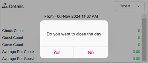 - A pop-up with the message 'Do you want to close the day' with Yes and No options appears.