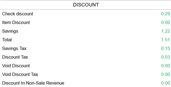 The discounts include the Check Discount, Item Discount and its Total followed by Saving Tax, Discount Tax, Void Discount, Void Discount Tax, Cash Reward and Discount in Non- Sale Revenue will be displayed.