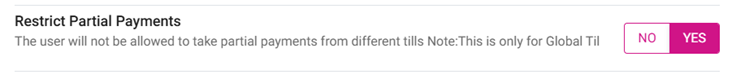 For the Restrict Partial Payments toggle: if enabled (set to YES): if Global Till is enabled, then partial payment cannot be allowed in different Tills.