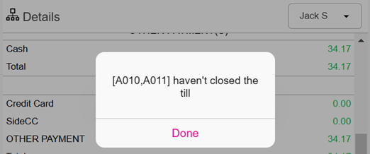 - If any cashier has open Till, then the message '<Node name> haven’t closed the till' appears.