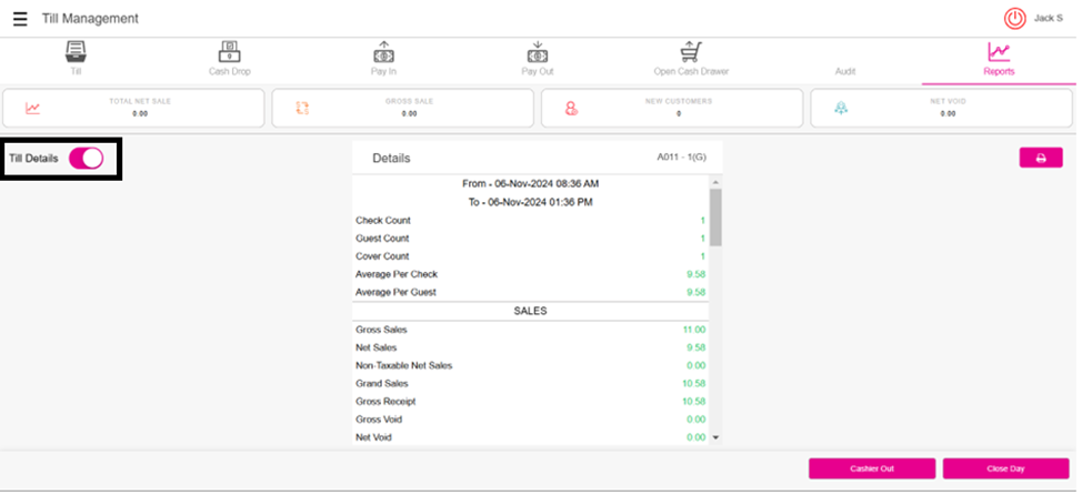 All the details available in the Cashier Out report will be displayed in the UI and in the receipt. [Sales, Taxes, Payment Summary, Till Summary, and all Sale Summary]