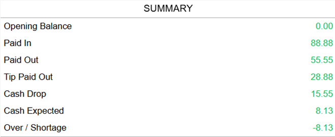 The summary includes Opening Balance, Paid In, Paid Out, Tip Paid Out, Cash Drop, Cash Expected and Over/Shortage.