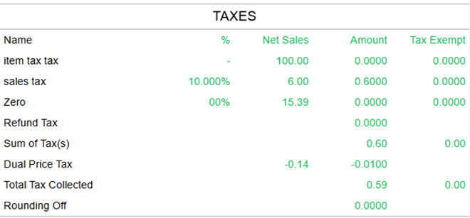 The Tax section has the columns such as Tax Name, %, Net Sales, Amount and Tax Exempt.