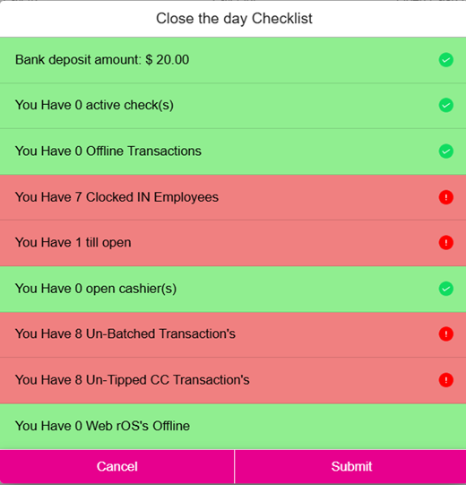 - Cancel: If clicked, the Close Day Checklist screen will be closed.