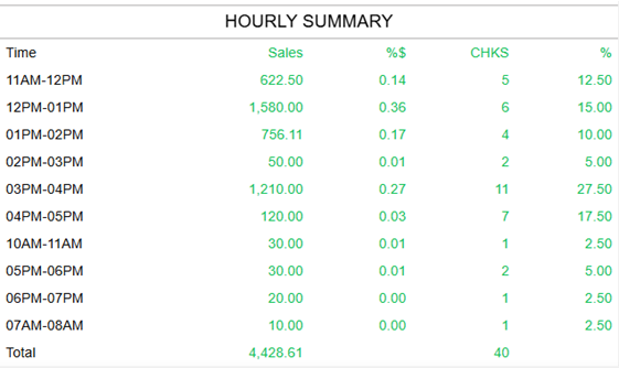 This displays the amount of sale made during each and every Hour- with the Total from all Hours' sales at the bottom. This section will only appear when the Hourly Summary toggle is enabled in Sale Recap Report Settings in BO.