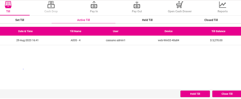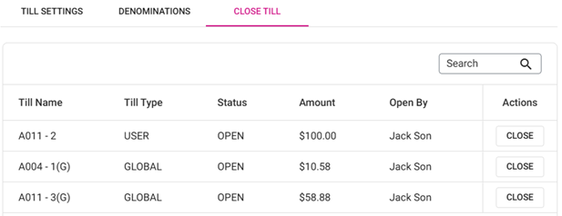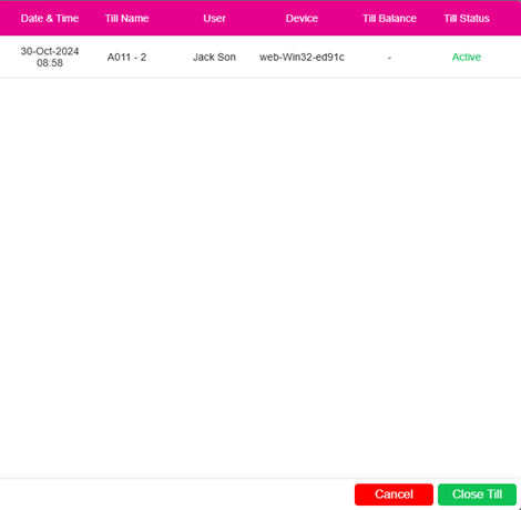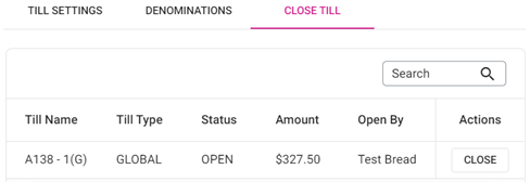 - Click the warning message. You will be taken to the Active Tills screen, where you can Close all the Tills.
