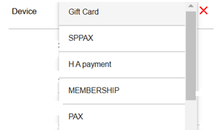 A filter option with a drop-down menu to select the payment device. Click the red x X to clear the search filter.