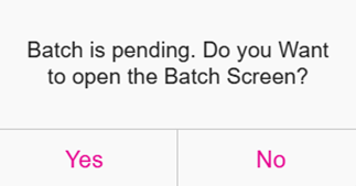 If any transaction is pending and Submit is clicked, the pop-up message 'Batch is pending. Do you want to open the Batch Screen?' appears, with Yes and No options.