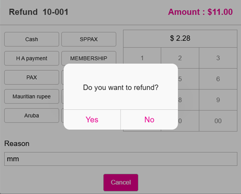 - With an Amount entered and a Payment Type selected, a pop-up with the message 'Do you want to refund?' appears - with Yes and No options.