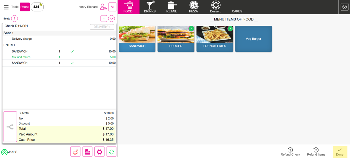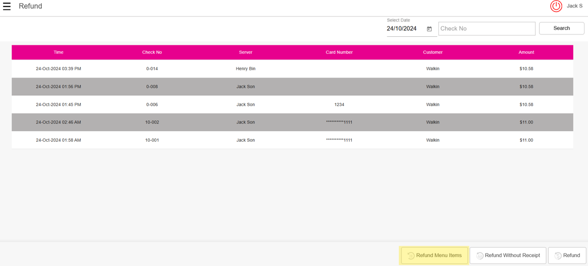 - The Order screen appears and displays the full Check with all Menu Items - along with the Refund Check and Refund Items options.
