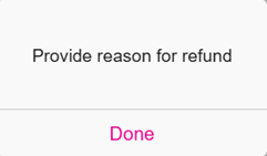 - If you attempt to select a payment type before entering a Reason: the pop-up message 'Provide reason for Refund' appears - with Done to close the message.