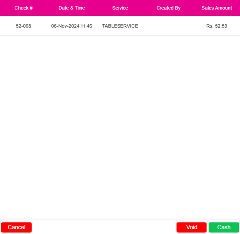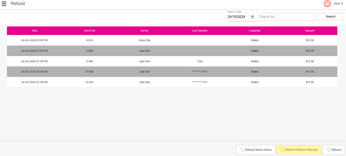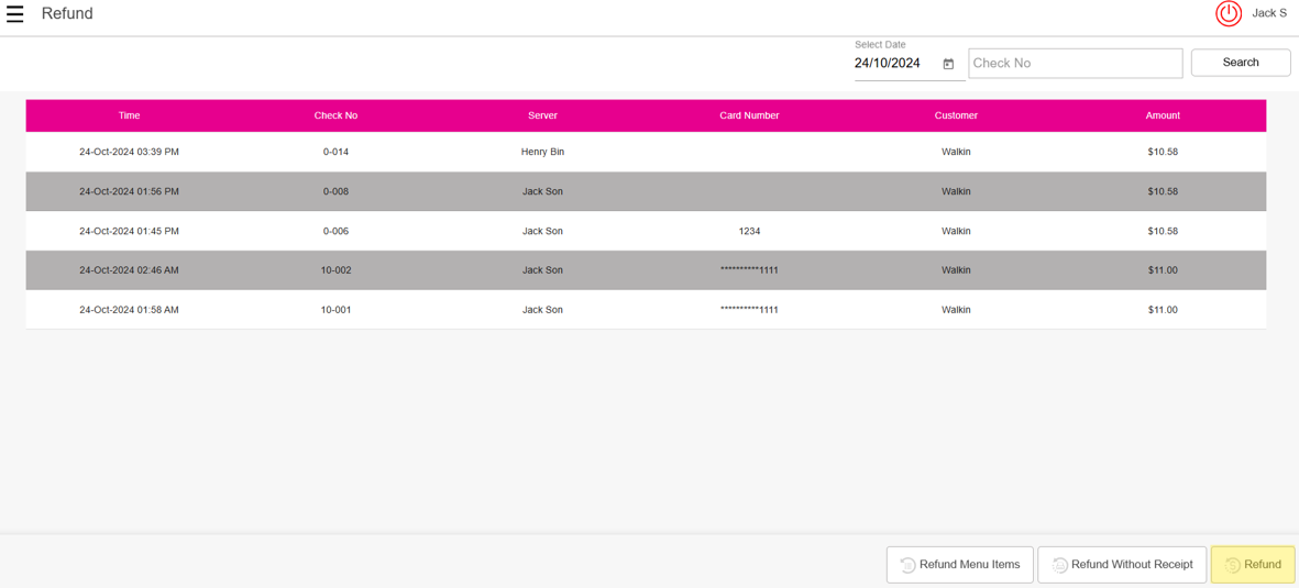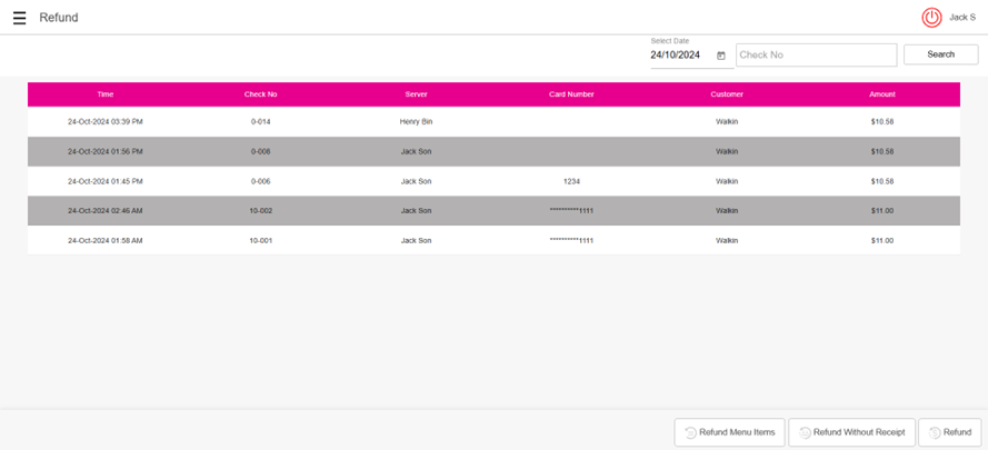 - The Refund screen displays all the checks place on the selected date in a table format with the following columns: