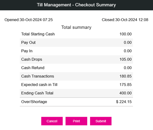 - Cancel: If clicked, the Close Day Checklist screen will be closed.