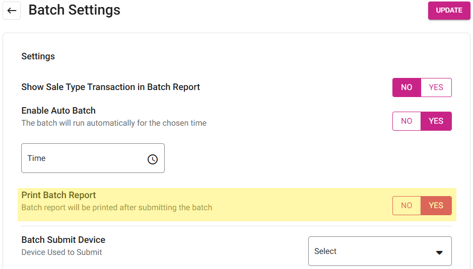 For the Print Batch Report toggle: if enabled (set to YES), the Batch report will be printed after submitting the batch