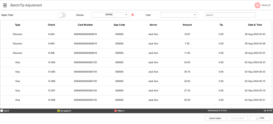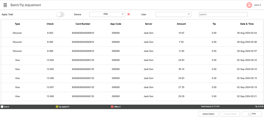 - User can place sale in POS, check will go to the batch screen and tip can be adjusted. Click Batch Submit, and all the payment will be processed.