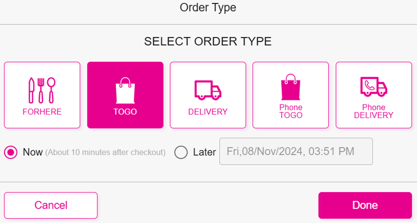 Once the Order Type and the Order Time is chosen, press Done. The Order screen appears.