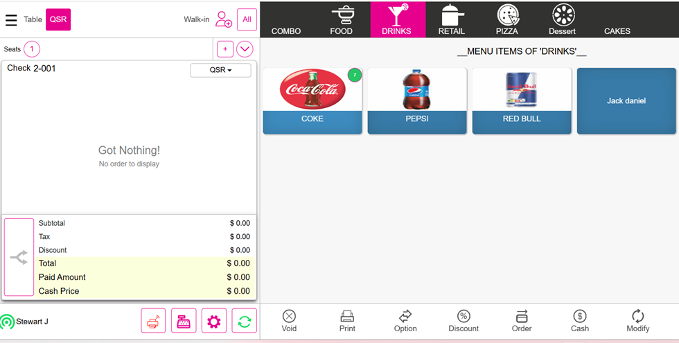 If the Order Type is enabled on the POS Settings screen, then the Order Type pop-up appears with the options configured in the POS Settings screen.