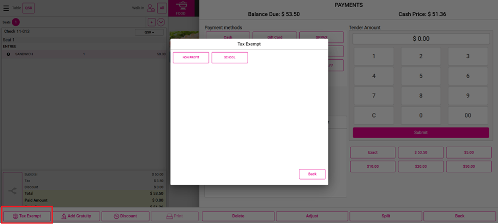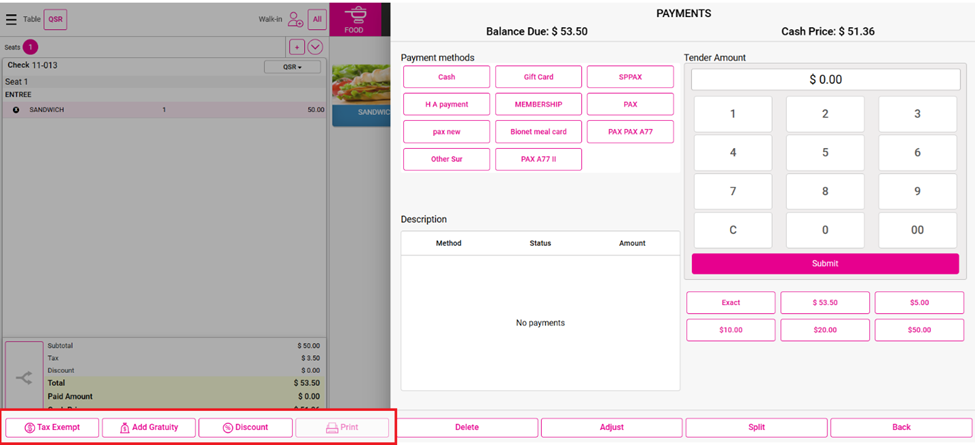 On the Payments page: the options Tax Exempt, Add Gratuity, Discount and Print options will appear.