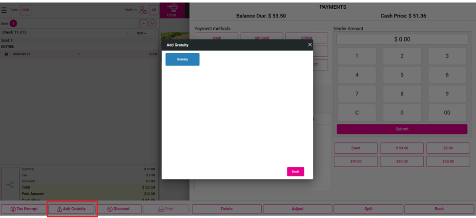 When Add Gratuity is selected, the Add Gratuity pop-up appears which displays the Gratuity options configured in BO.