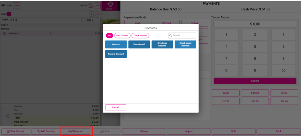 When Discount is selected, the Discount pop-up appears which displays the Discount options configured in BO (broken down by Item and Check).