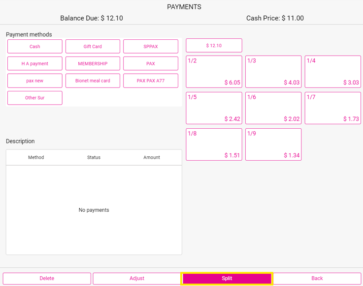 If another Split combination is selected for the Balance Due amount: that Amount will be split based on the combination selected, and the value will appear under the Payment Method section.
