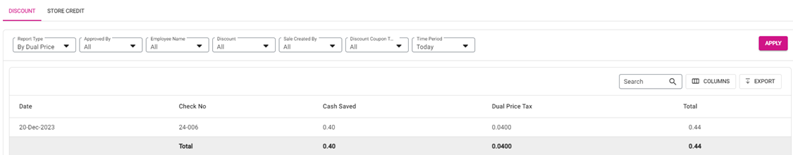 Note: In this instance - the Dual Price (name) will appear and not the Name defined in the Discount section for Dual Price. The remaining Report will show the Name defined in the Discount section for Dual Price.