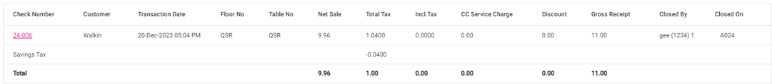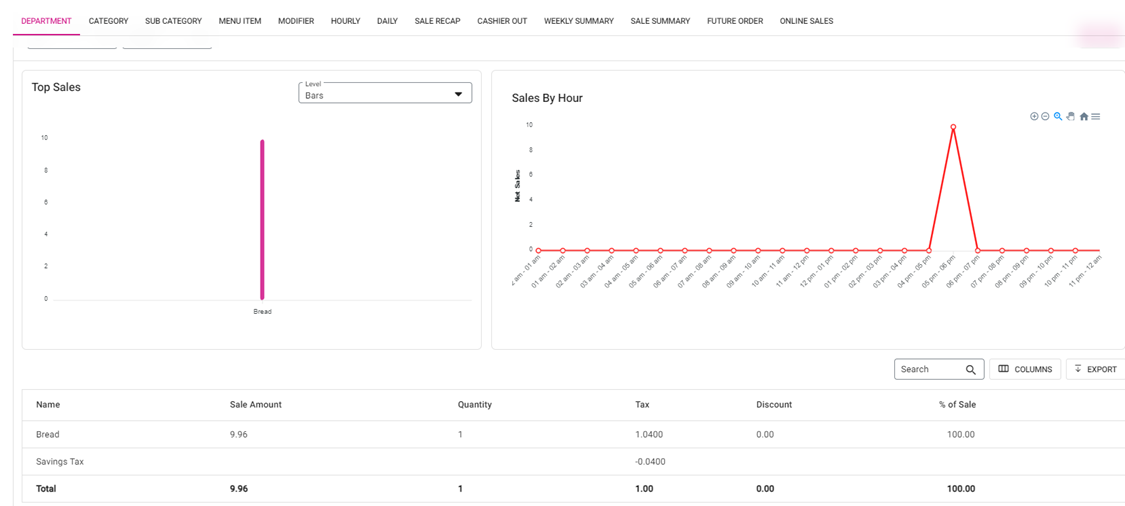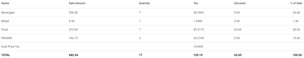 In the Department, Category, Subcategory, Menu item, Hourly sale, Daily sale, and Sale Summary reports: there will be a line item added to the report with the Dual Price Tax value, which will be subtracted from the Total Tax.
