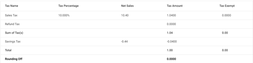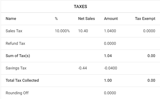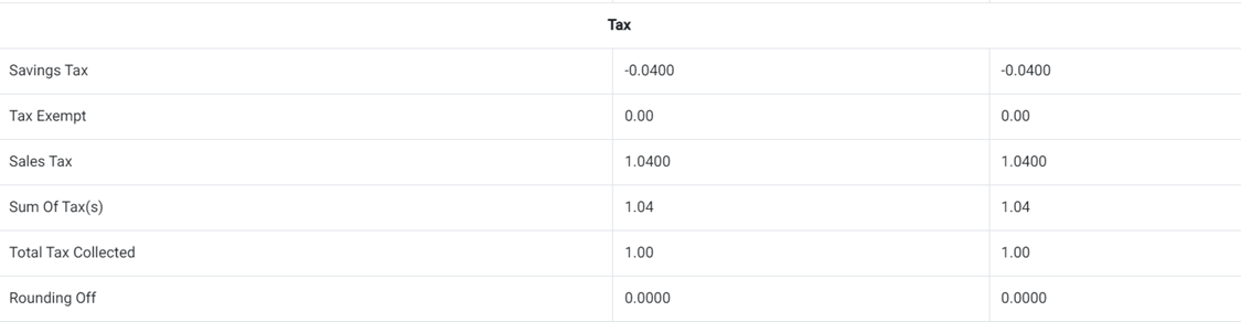 Dual Price Tax will appear in the tax’s Name column. The Net Sales data made from the sale will appear in the Sale column, the Tax calculated will appear in the Tax Amount column and the Tax Percentage should be shown in Tax Percentage column.