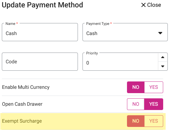 Navigate to the Settings > Payments > Payment Methods page. With the Payment Surcharge toggle enabled: when creating a new Payment Method (or updating an existing one), the Exempt Surcharge toggle will appear.