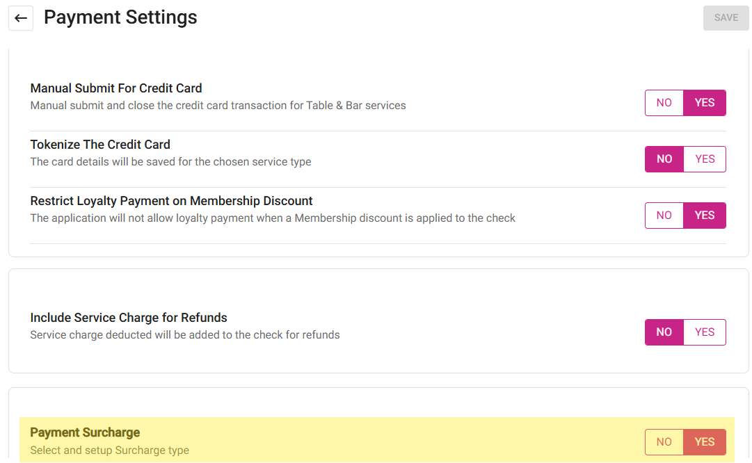 On the Payment Settings page, enable the Payment Surcharge toggle.