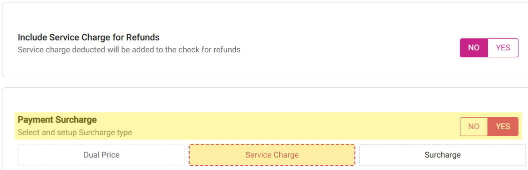 Back Office Payment Settings Navigation: Log into BO for your Store, then select Settings > Payments > Payment Settings For the Include Service Charge for Refunds toggle: If enabled, the service charge will be added to the Check. If disabled ...