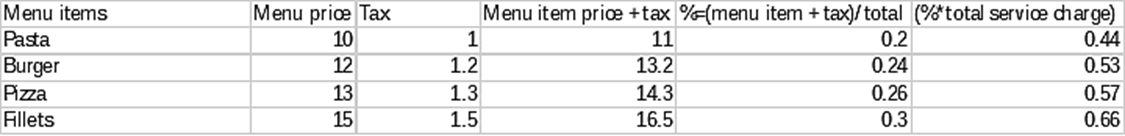 The split for the individual Menu Items will be calculated based on the formula = (Menu Item + Tax / Subtotal) *Total Service Charge.