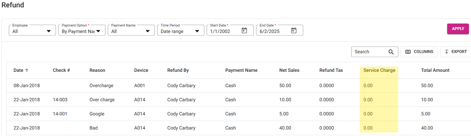 The Service Charge column displays the value of any Service Charge refunded for the select Check.