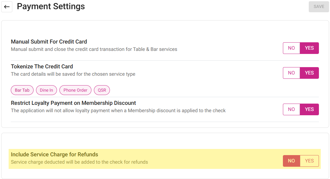 Back Office Navigation: Log into BO, and for your Store select Settings > Payments > Payment Settings On the Payment Settings page, ensure the Payment Surcharge toggle is enabled (set to YES). After enabling the toggle, select the Service Charge ...