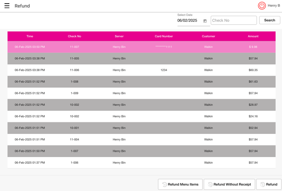For a Refund on a Menu Item: only the Card Service Charge will be calculated as per formula. The Item Service Charge will not be included.
