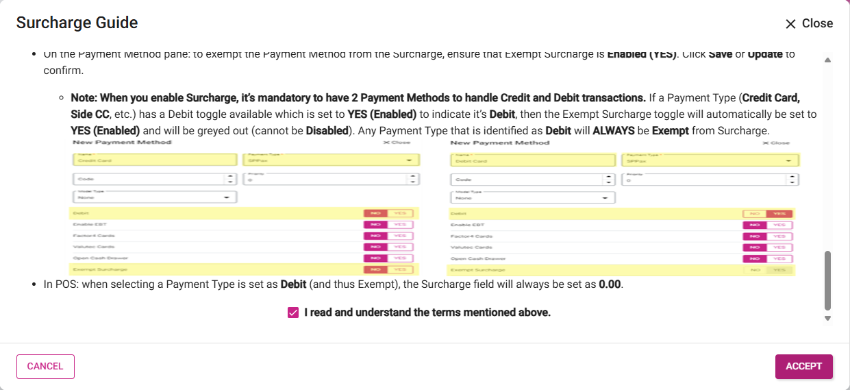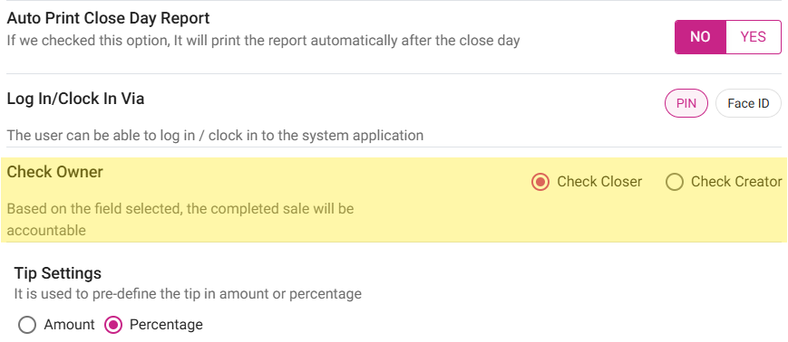 Enable online pickup tip, Enabled declared cash tip, Disabled Gratuity, Disabled Driver compensation | CC tip - Tip charge- Tip out Contribution + Online Pick-up tip + Declared cash tip | Tip shared + Tip out + Gratuity + Driver compensation |