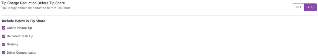 Enable online pickup tip, Enable declared cash tip, Enable Gratuity, Enable Driver compensation | CC tip - Tip charge - Tip out Contribution + Online Pick-up tip + Declared cash tip + Gratuity + Driver compensation | Tip shared + Tip out |