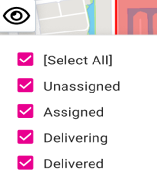 Use the eye icon to filter Checks/Orders by their Status. Select the corresponding checkbox to Show (or uncheck to Hide) Orders with that Status: Unassigned, Assigned, Delivering, and Delivered.