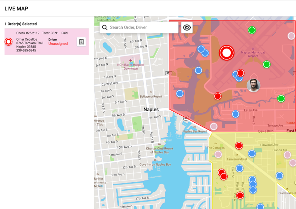 Click on a round icon (representing an Order) on the Map. The icon changes to the corresponding color with a white circle and the order details will appear on the left side with its Status - along with the Check Number, Total Amount, Status of Amount (paid or unpaid). Address, Driver Status (assigned, delivered) and the Receipt icon.