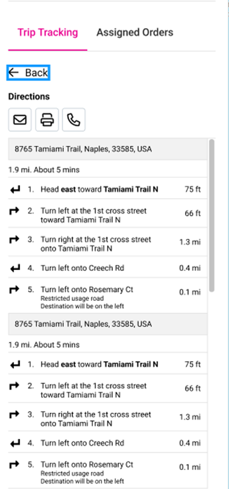 Select a Trip and you can view directions for the current Trip along with Navigation options which include detailed directions, with the <- Back button to return to the main Driver Map window. Between Directions and the Navigation options are options for transmitting the directions.