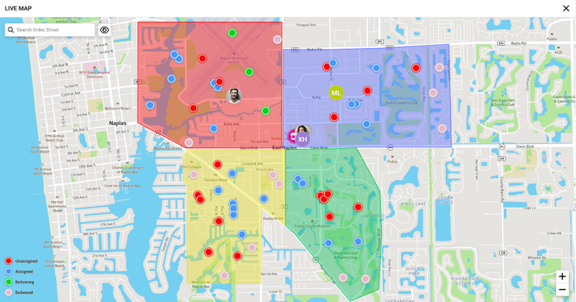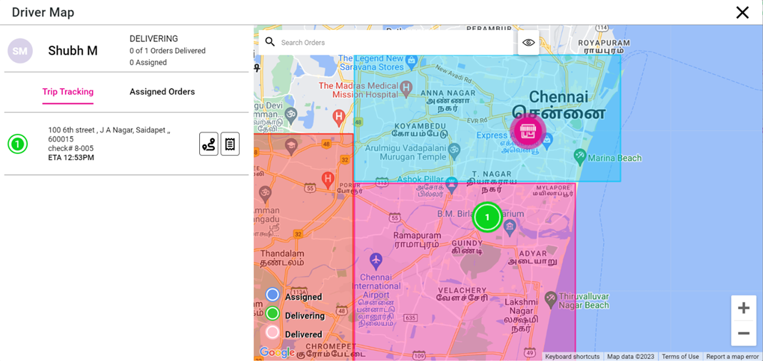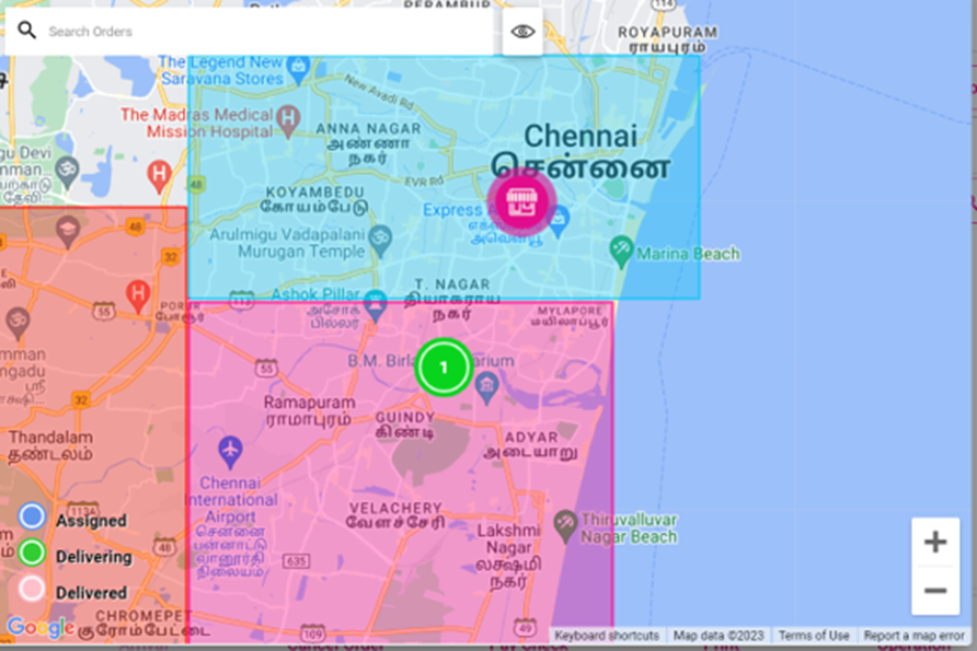 Click the Live Map button to view the Map screen with all active Driver details along with their delivering Orders. The Map screens show the live location of all Drivers with the corresponding Order details in different Zones. Each Zone will be highlighted in different colors.