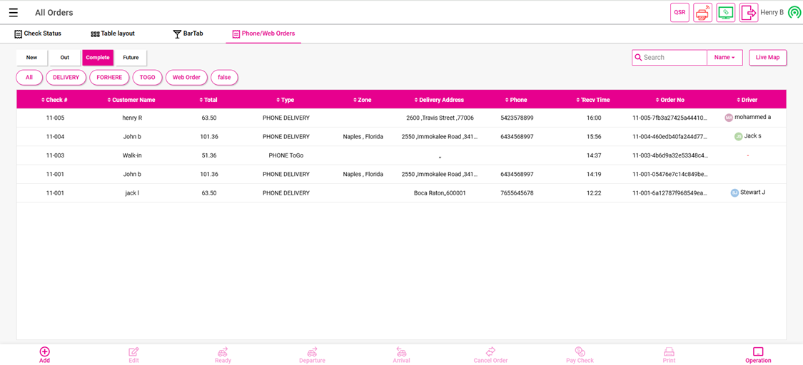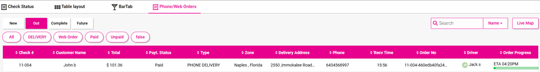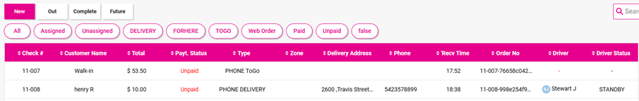 Shows all the new phone orders along with Check, Customer Name, Total Amount, Payment Status, Type, Zone, Delivery Address, Received Time, Order Number, Driver Assigned (or not) and Driver Status - and you can view the status of all drivers under Driver Status (Standby, Returning, or Delivering).