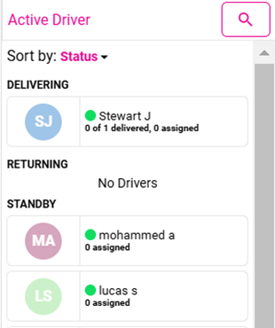 Active drivers will have a green icon while Inactive drivers (when the toggle is enabled), but ready to take orders are in red icon. Active Driver search option will show for new orders. You can search for a Driver by their Name with the magnifying glass and entering a single character (letters only). Drivers are organized by Status: