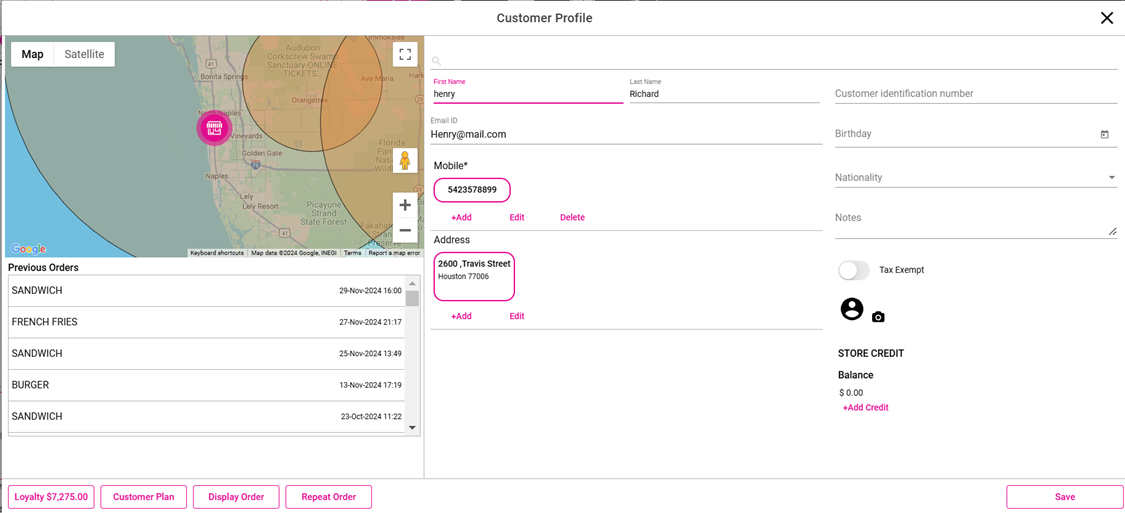 Once a Customer is selected from the search, the Customer Profile screen appears where you can save the customer profile after all mandatory information is entered - such as Address, Phone Number, etc.