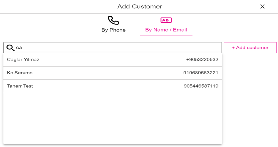 A 2-character search is required to show results. If there's no match on an existing Customer, then 'No Results' appears.