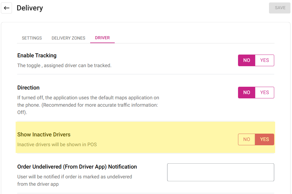 Prerequisite for ETA (Estimated Time of Arrival) for Stores. In Back Office, select Settings > Application > Delivery. Under Delivery Zones, set the Expected Delivery Time.