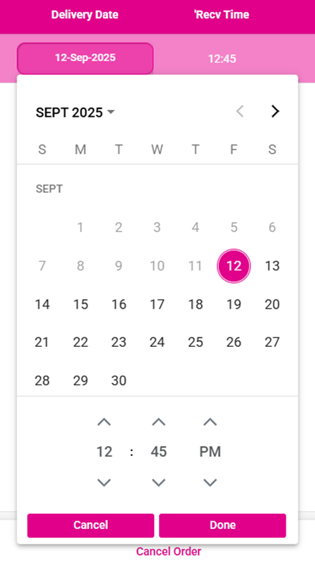 Tap on the order’s Delivery Date to open a calendar and clock. It defaults to the existing Day and Time selected for the order. Click on a new Date on the calendar to change the Date. Use the up and down arrows on the Hour, Minutes and AM/PM clock fields to adjust the time the Order should be ready. Then tap on Done.